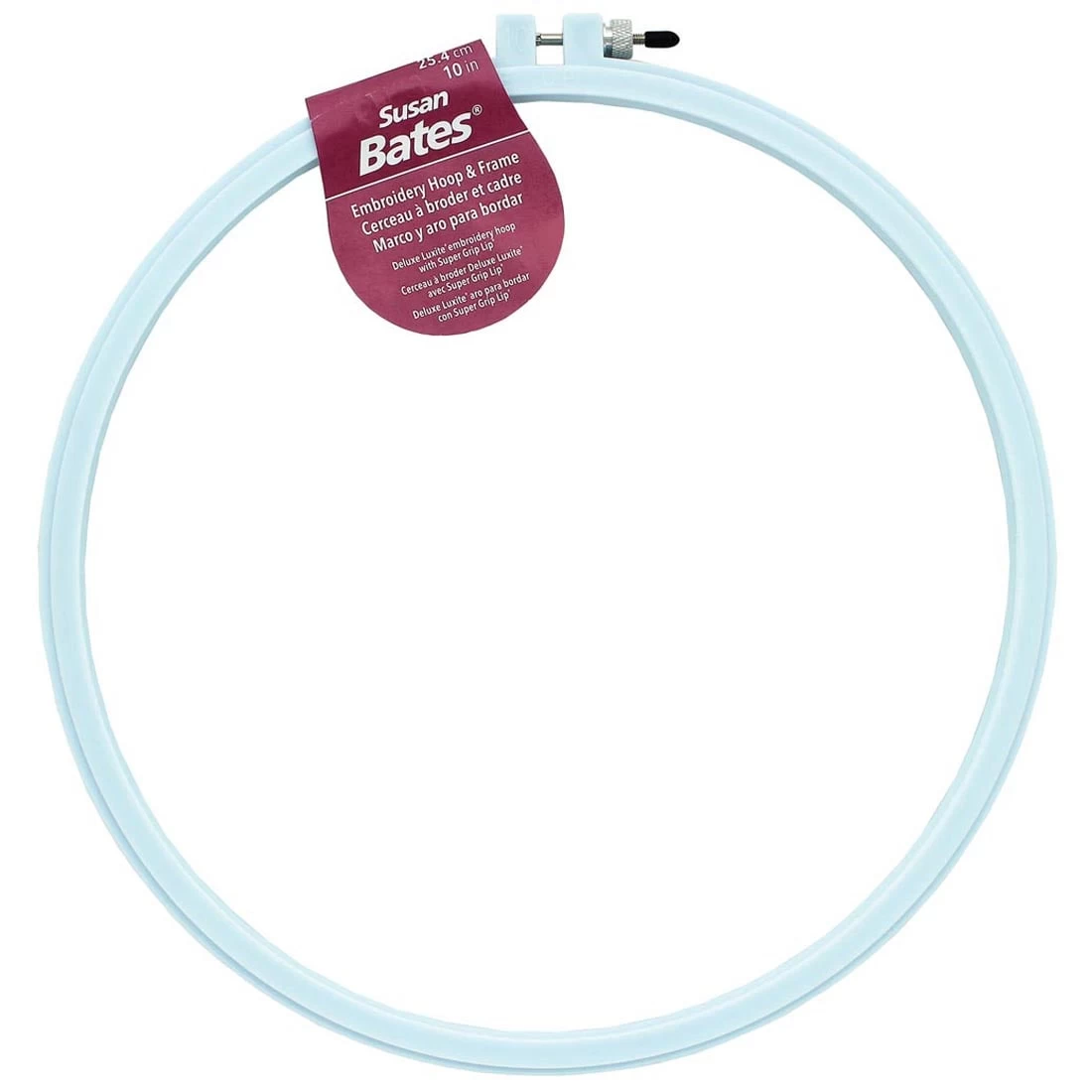 Molded, plastic hoop is preferred by some crafters for its soft surface and tight grip. Features the Super Grip Lip that always keeps your project securely in place. 10″. Color may vary.