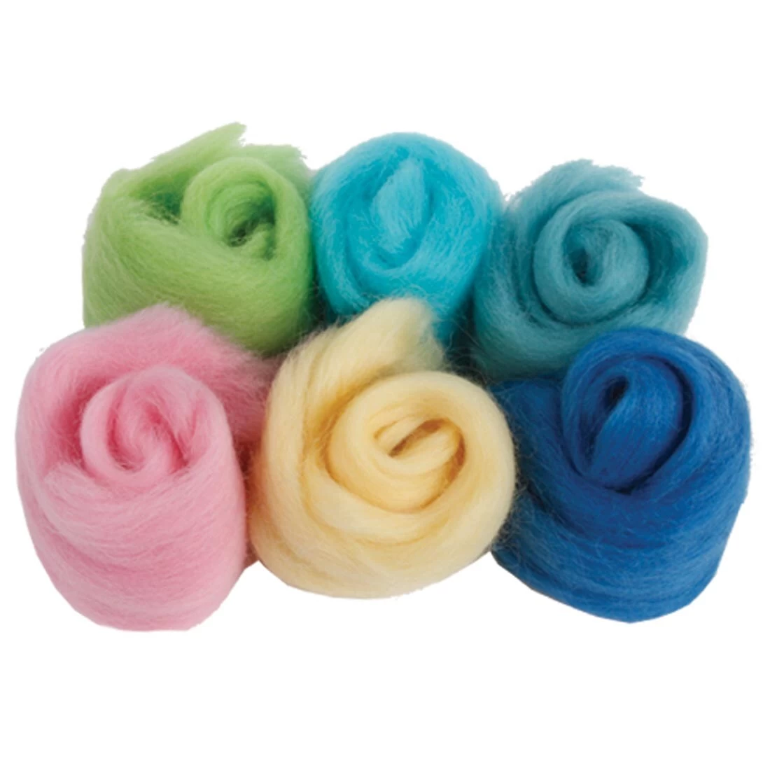 100% wool fiber for wet or dry felting techniques, plus a variety of craft projects. Package contains 2 oz. net weight of wool fibers in six different colors. Colors in assortment may vary.