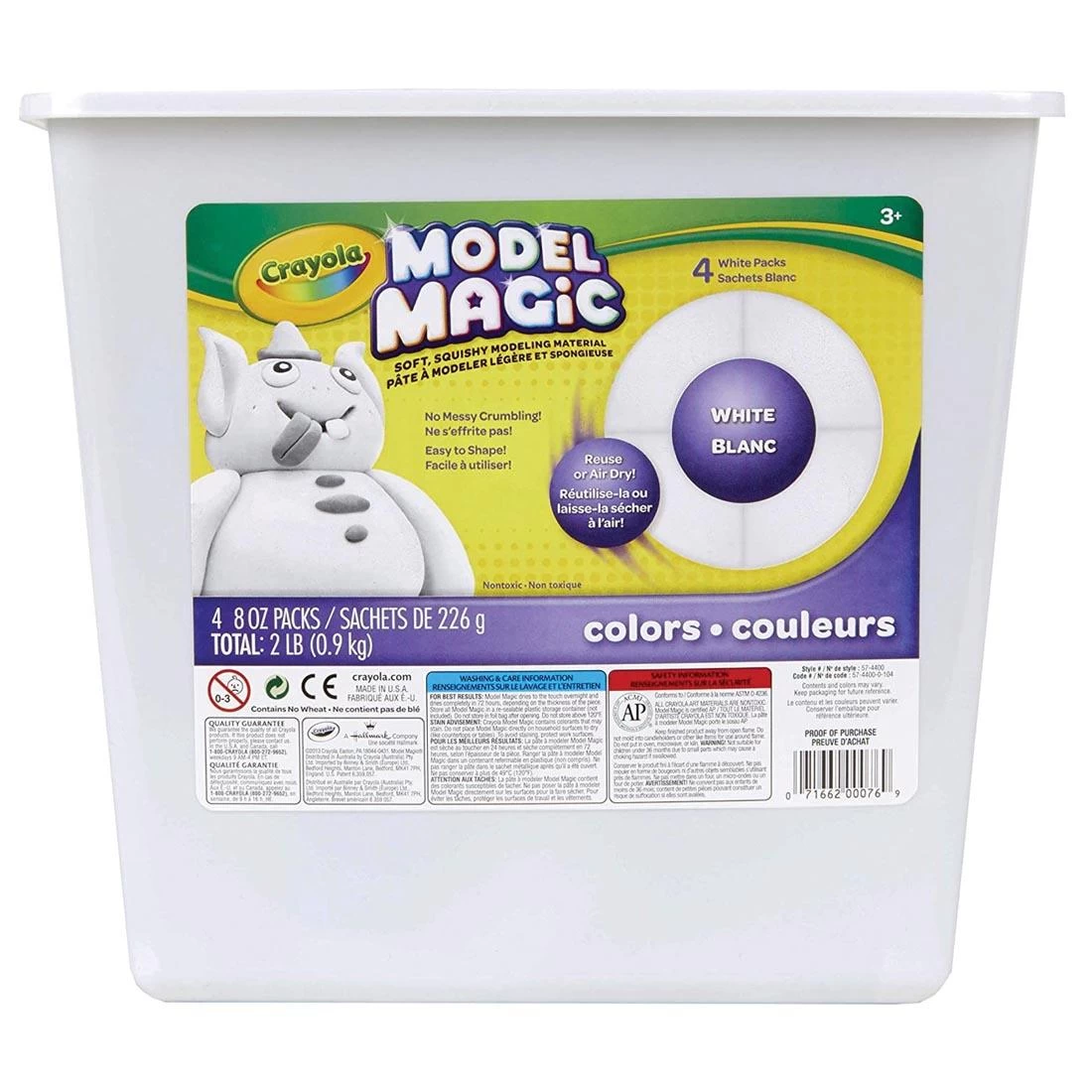 Preschoolers love the soft, pliable texture of Model Magic modeling material; older kids love its versatile, lightweight characteristics. Teachers love its easy-to-clean formula that will not stick to skin, classroom surfaces, clothing or carpeting. Before dry, add decorative items, like buttons and springs, yarn or sequins; they will stay securely after dry. Air dries in 24 hours without firing or baking. Decorate finished pieces with tempera, watercolor, acrylic and markers! Safe and easy-to-use, even for preschoolers. Won’t flake or crumble. Mix individual colors to make new colors! 8 oz. pouches of white Model Magic in resealable tub. 2 lb. total weight. Model Magic does not contain wheat, latex, dairy, casein, egg, peanuts or tree nuts. AP Seal, non-toxic.