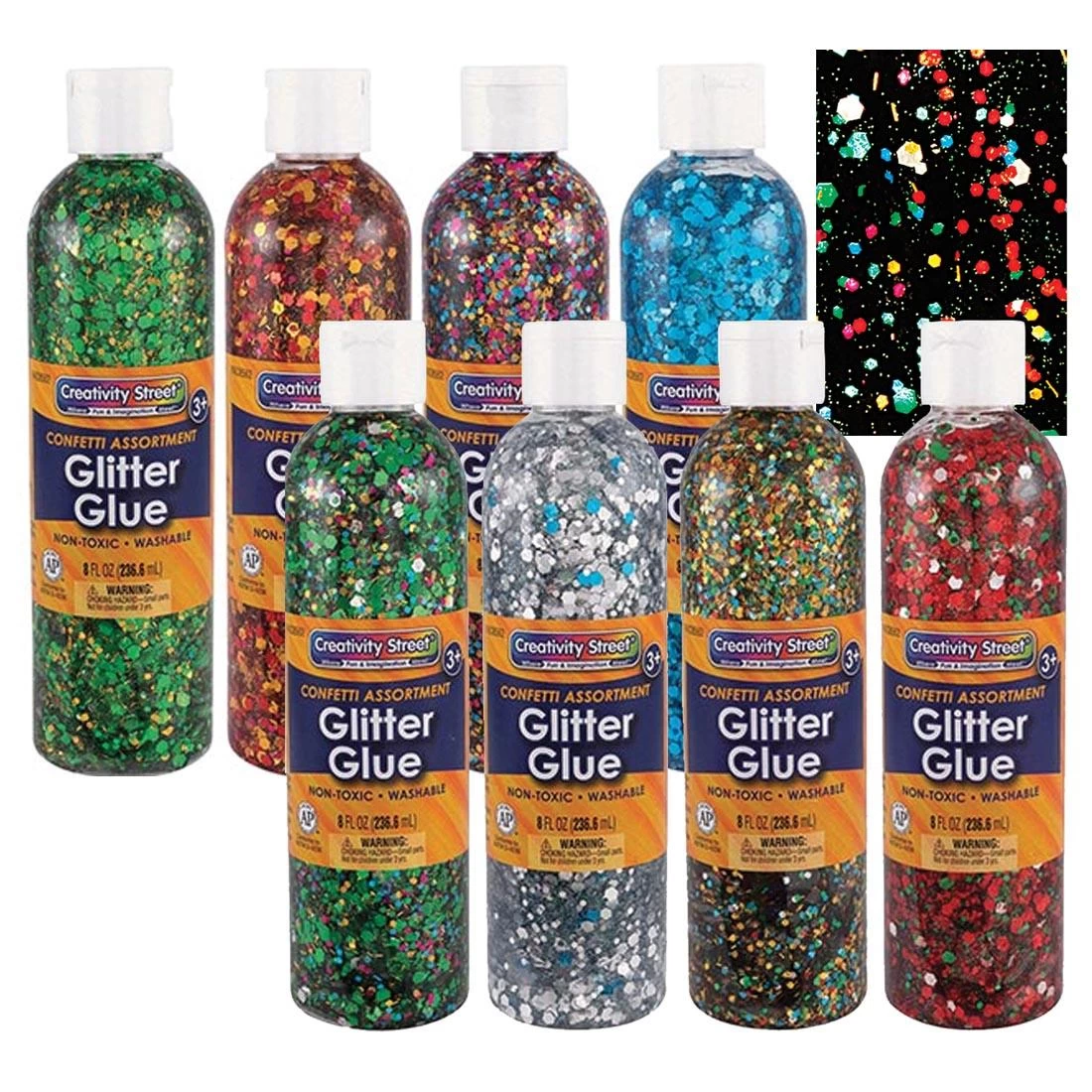 Add dazzling accents and sparkle to your craft projects with brightly colored glitter glue featuring large sparkling confetti chips. 8-color assortment contains 8 oz., classroom-size, flip-top bottles. Non-toxic. Conforms to ASTM D4236.