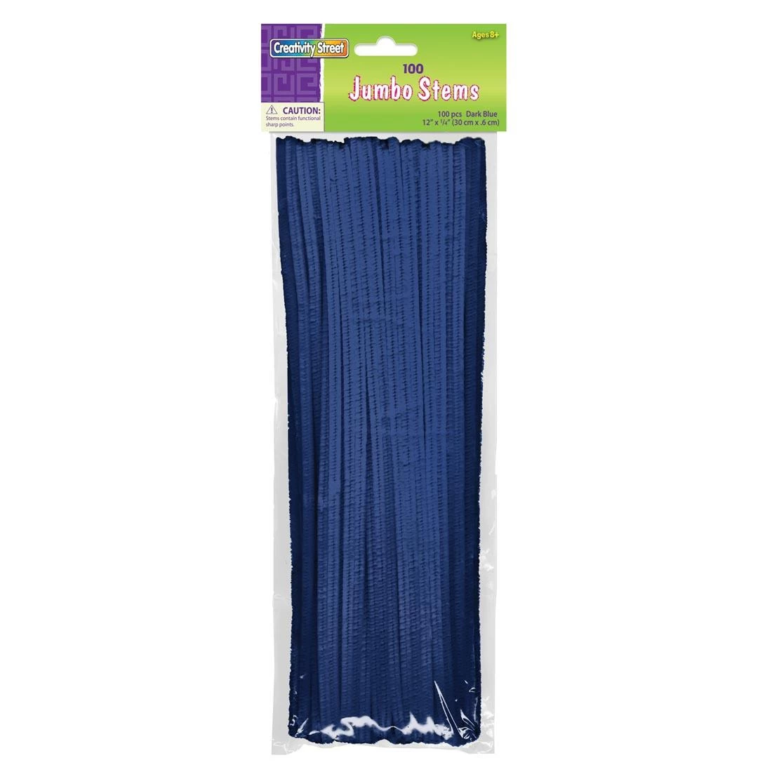 Also known as chenille stems or pipe cleaners, these stems are terrific for crafts. The hidden wire allows them to be twisted together easily, plus they can be glued onto surfaces. Also great for stringing beads. Jumbo stems are 12″ long and 1/4″ wide. 100 stems per package. Dark blue.