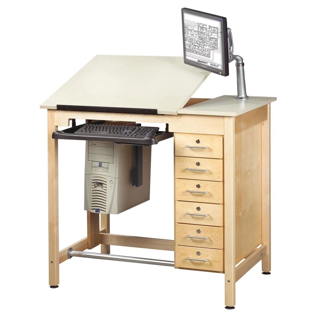 Diversified Spaces quality hardwood drawing table is designed to meet sensitive budget requirements! Has a 3/4″, almond colored, high pressure laminate 2-piece top. 30×30″ portion adjusts for a comfortable angle while working and features a mounted pencil stop. Comes standard with a CPU holder, monitor arm, keyboard tray, mouse tray and cable manager (computer not included). Constructed of solid maple framing and legs. Finished with an earth-friendly UV coating. Overall size of the table is 39-3/4″ high, 42″ wide, 30″ deep. Features six lockable drawers measuring 2-3/4 x 7-1/2 x 16″. Lifetime limited manufacturer’s warranty.