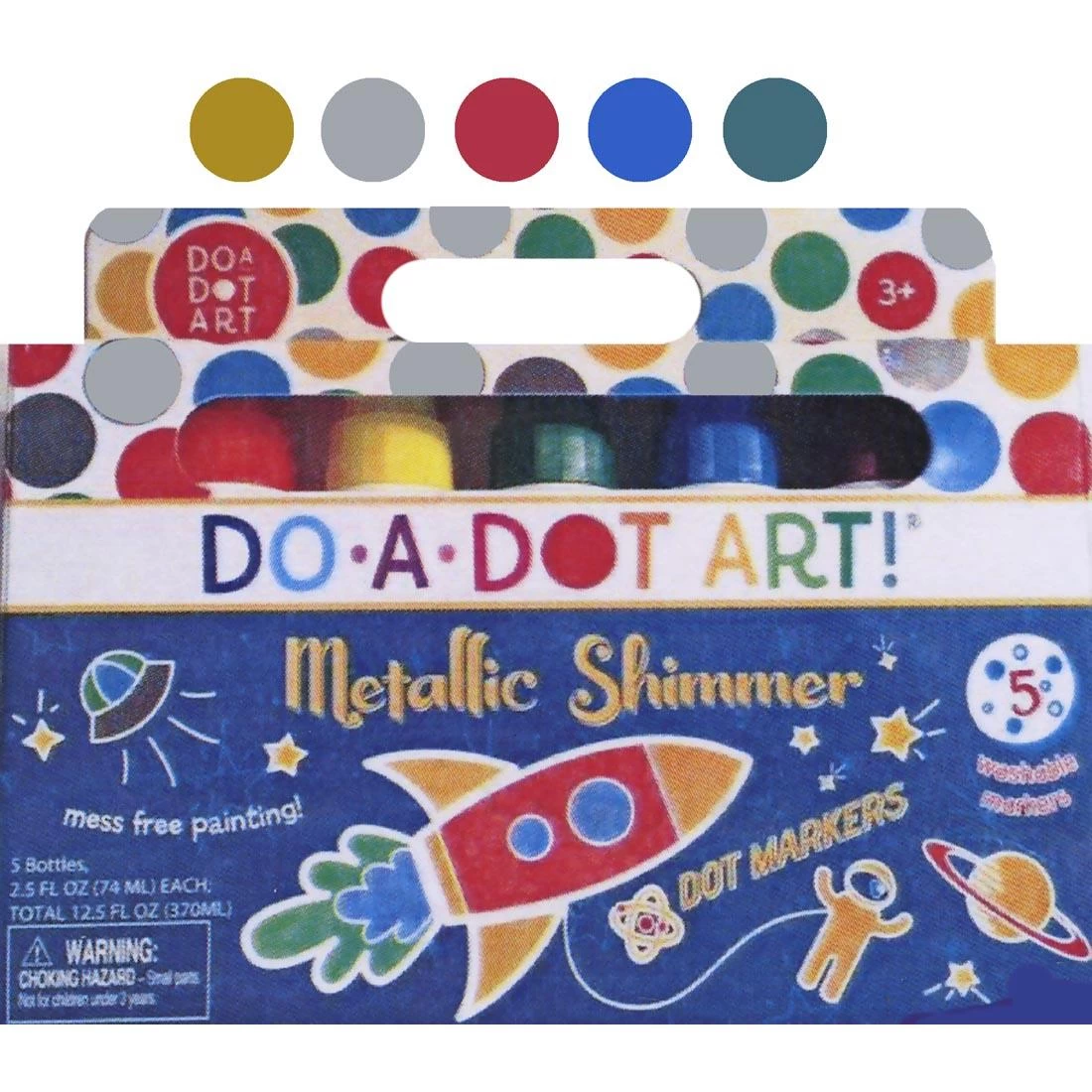 The fun way to create art without paint cups, brushes or the mess! Spark imagination and awaken creativity in young artists. Just twist off the cap and dot the five metallic shimmer colors. Machine washable from most fabrics. 2.5 oz. of color in easy-to-grip squeeze bottles with sponge-tip applicators. Non-toxic formula. Conforms to ASTM D4236.