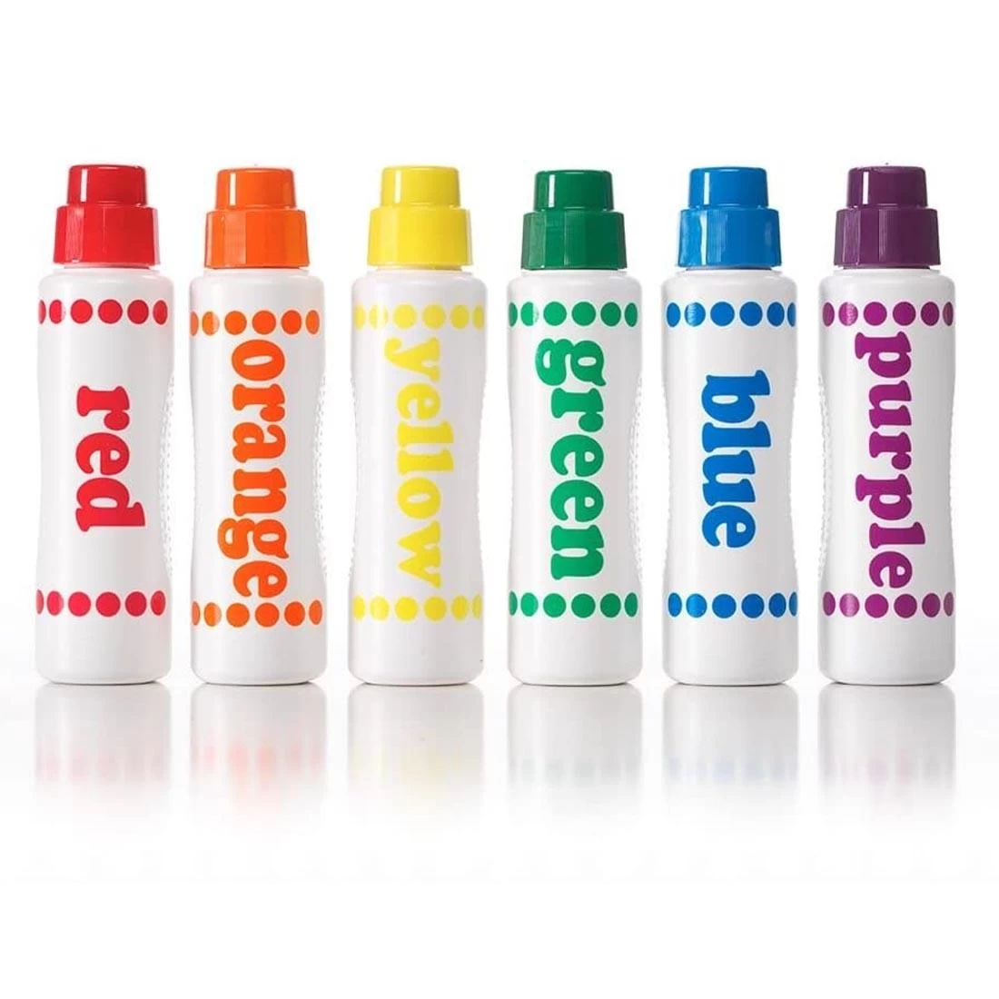 The fun way to create art without paint cups, brushes or the mess! Spark imagination and awaken creativity in young artists. Just twist off the cap and dot the washable colors. Machine washable from most fabrics. 2.5 oz. of color in easy-to-grip squeeze bottles with sponge-tip applicators. Six rainbow colors include blue, green, orange, purple, red, and yellow. Non-toxic formula. Conforms to ASTM D4236.