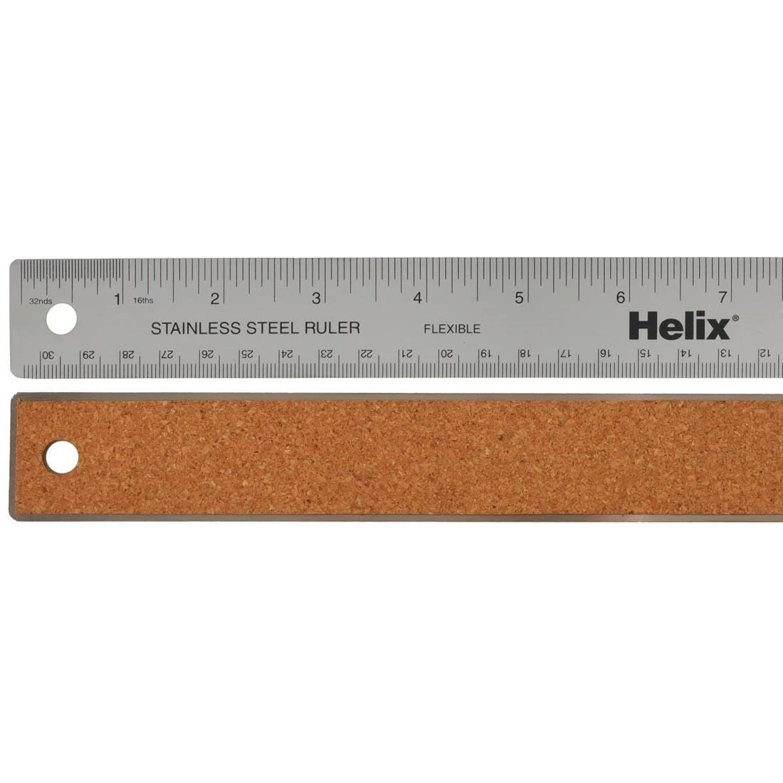 Finest quality, flexible stainless steel with permanent, acid-etched graduations. Scaled in sixteenths and millimeters. Non-skid, cork backing prevents slipping. Raised edges eliminate ink blots and smearing. 18″ long.