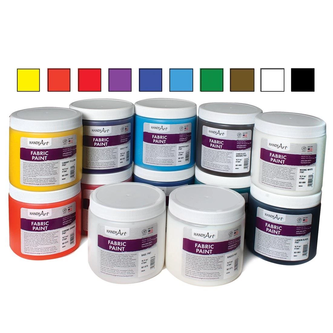 Create vibrantly painted garments and textiles with Handy Art Fabric Paints! Ready-to-use and water-soluble textile paint is non-toxic and affordable for the classroom or an organization. Decorated fabrics stay soft and flexible when dry. Colors are permanent after heat-setting with a household iron. 12 pint set includes: canary yellow, carbon black, chocolate brown, chrome orange, flag red, forest green, mixing white, phthalo blue, skipper blue and violet, plus base coat and binder.