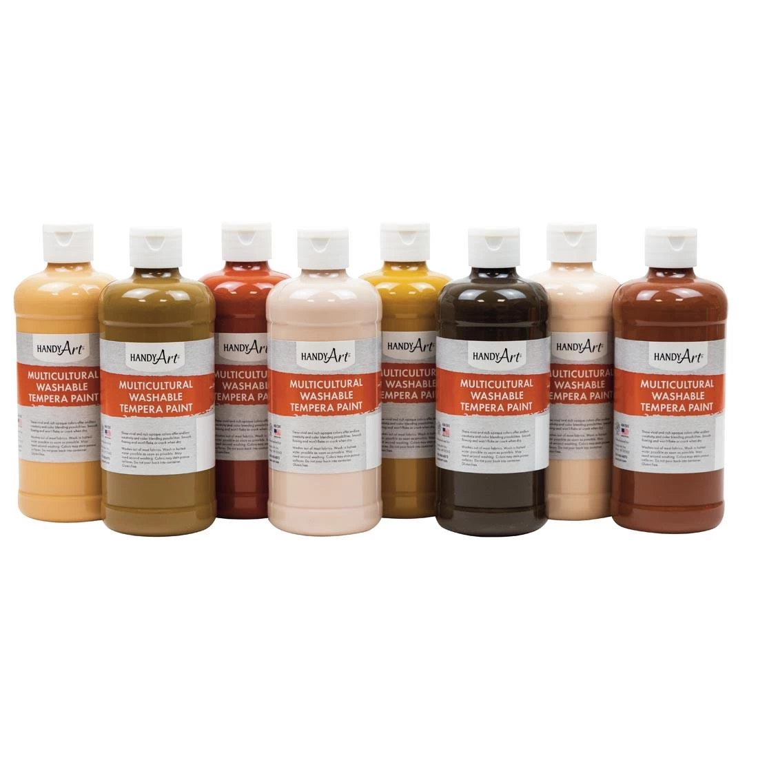 One of our most popular economy paints. Washable tempera paints make cleanup quick, since they wash out of clothes as easily as they wash off of little hands. Children will love the bright colors and you’ll love the value. Includes beige, mahogany, mustard, nutmeg, olive, peach, salmon and tan. Pint bottles. AP Seal, non-toxic.