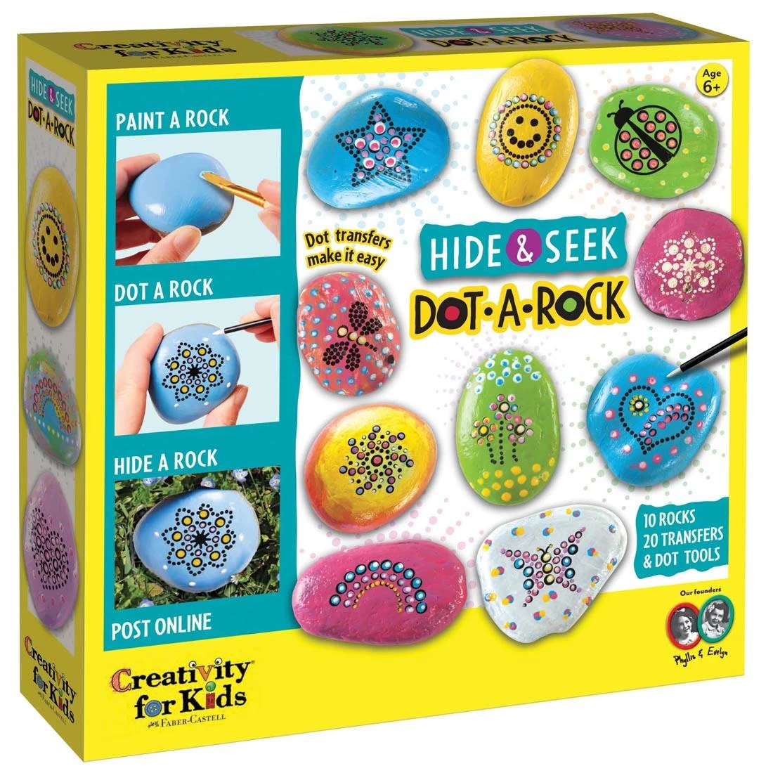 Unleash your creativity with this rock painting kit! Features dotted transfer designs, so you can easily take your art to the next level. Once your designs are dry, place the clear tracking stickers on the bottom of your rocks to follow their travels! Paint and decorations are weather-resistant, so you can hide the rocks in your yard, community and neighborhood. Includes 10 rocks, 7 colors of weather-resistant paint, dotted transfer designs, 4 gold transfers, paint brush, 3 fine-point dot tools, transfer sponge and tracking stickers. Non-toxic. For ages 6 and up.