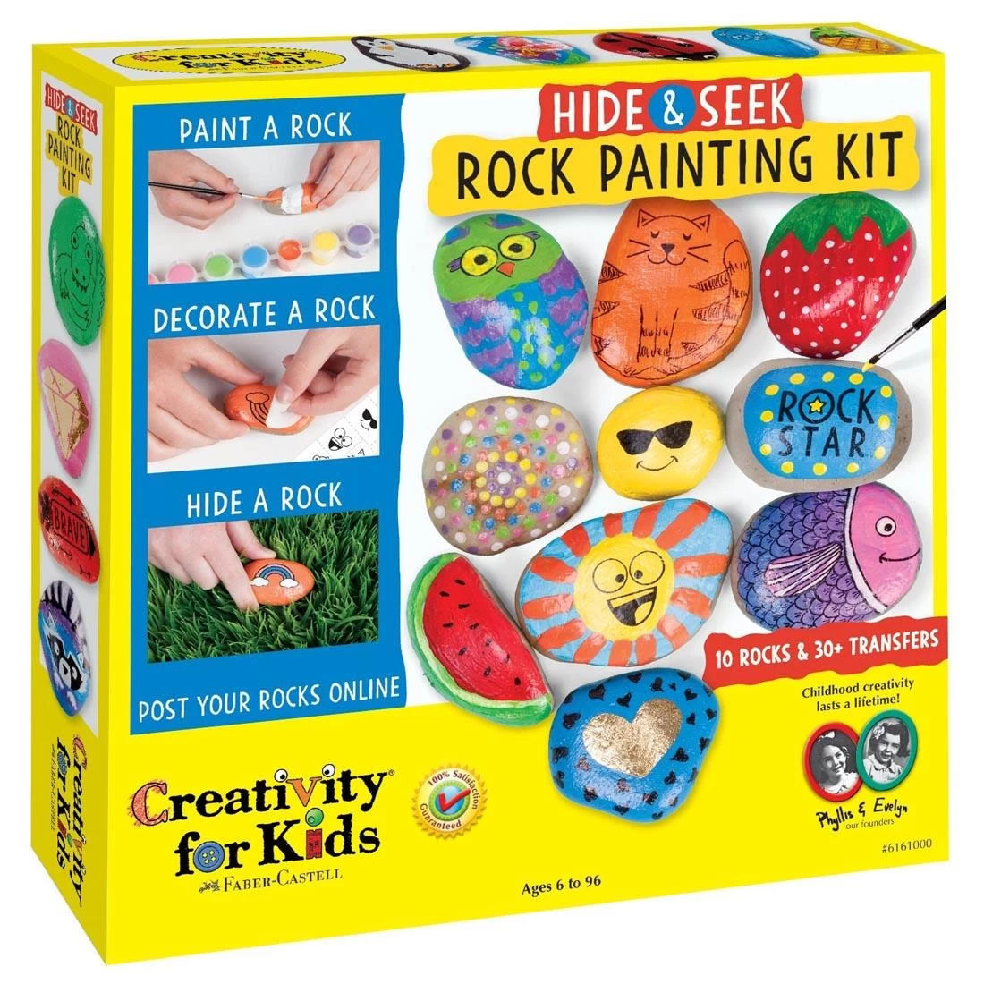 A fun way for you, your friends and family to spread kindness, encouragement and happiness throughout your community – one rock at a time. Kit includes 10 natural river rocks, water-resistant paint, 2 brushes, and more than 30 waterproof transfer designs. For ages 6 and up.