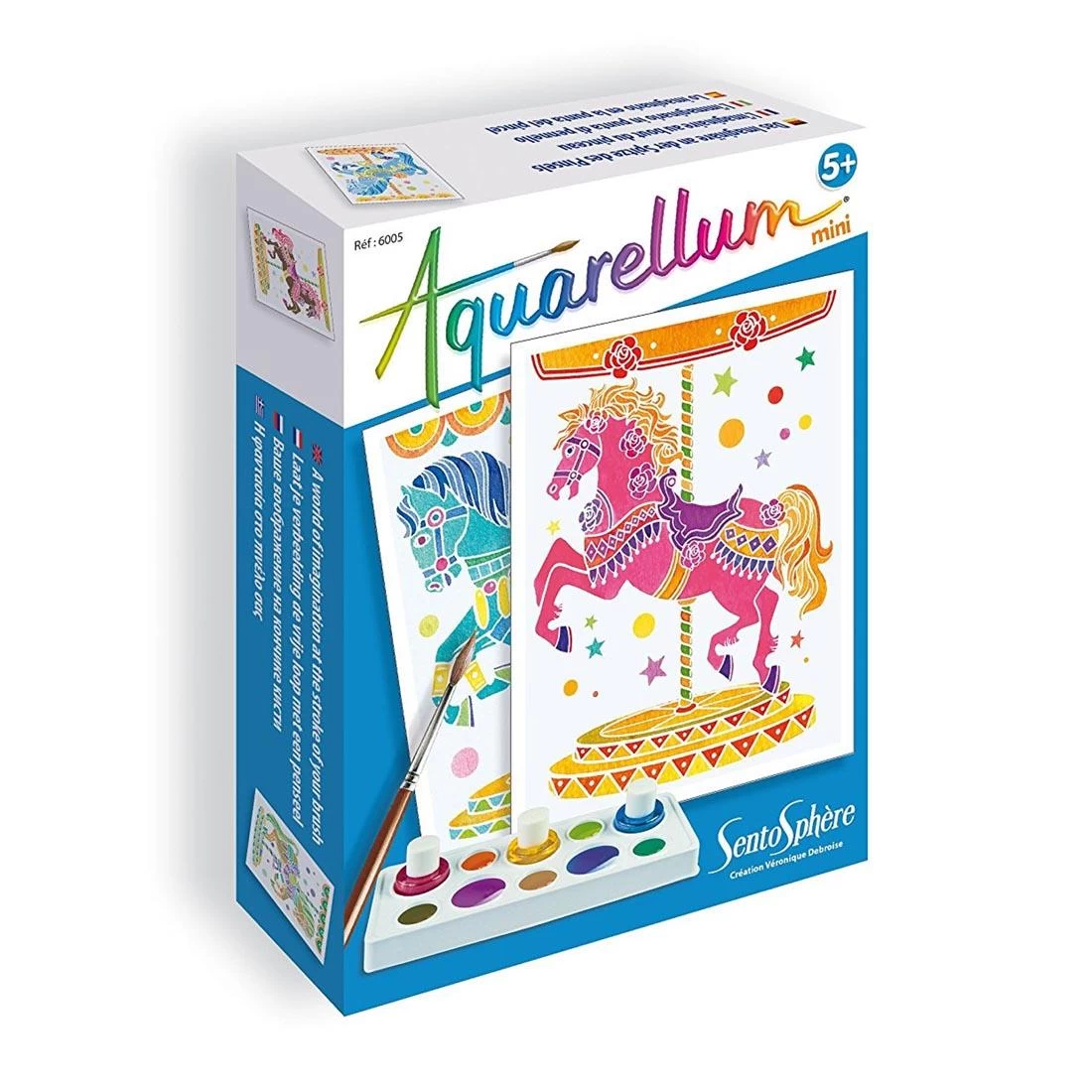 Experience the “magic” of watercolor painting! Aquarellum features unique, embossed picture cards that absorb watercolor paint in some areas and repel it in other areas to create intricate, detailed works of art. Even young children can achieve terrific results. Includes two 4.7 x 6.3″ carousel horse picture cards and three washable, non-toxic watercolors; plus a palette for mixing custom colors, a paint pipette, a brush and a color guide. For ages 5 and up.