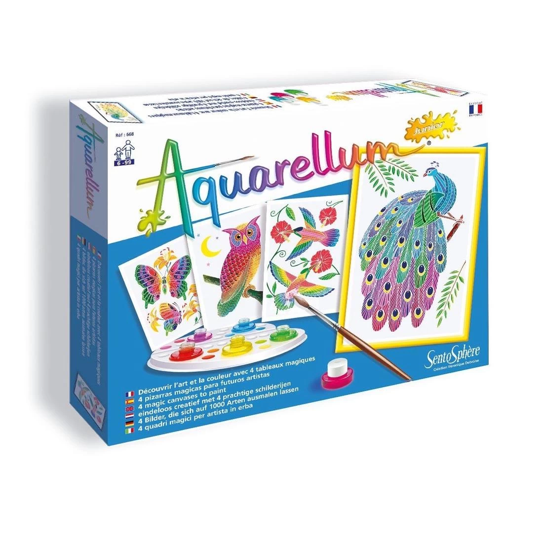With just a few drops of paint, any child can create a true masterpiece! Aquarellum Junior is based on a masking technique on vellum paper, allowing the watercolor paint to adhere only to selected areas. The design is gradually revealed with every brush stroke, and may be painted over repeatedly to obtain a perfect picture. Ideal for introducing children to the art of painting, understanding the mixing of colors and stimulating imagination and concentration. Includes four, ready-to-paint, 7.1 x 9.8″ canvases and five washable, non-toxic watercolors; plus a palette for mixing custom colors, a paint pipette, a brush and a color guide. For ages 6 and up.