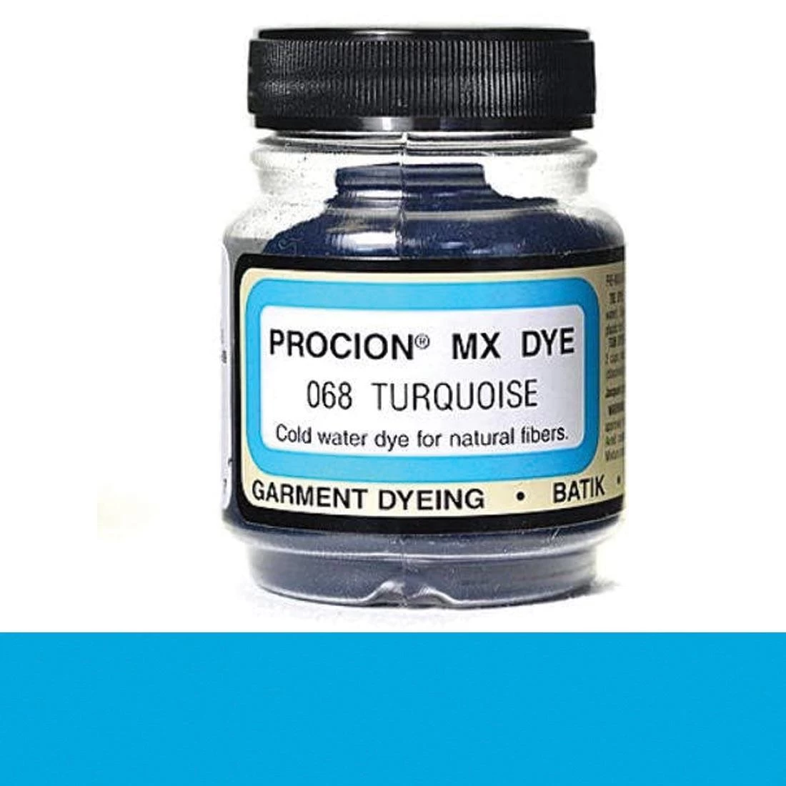 The professional choice for tie-dyeing or batik. 2/3 oz. jar of concentrated powder dyes up to a pound of fabric. When using a squirt bottle, dissolve two teaspoons in a cup of hot water. Use more dye for deeper colors; less for pastels. Use soda ash to fix, sold separately. Turquoise.