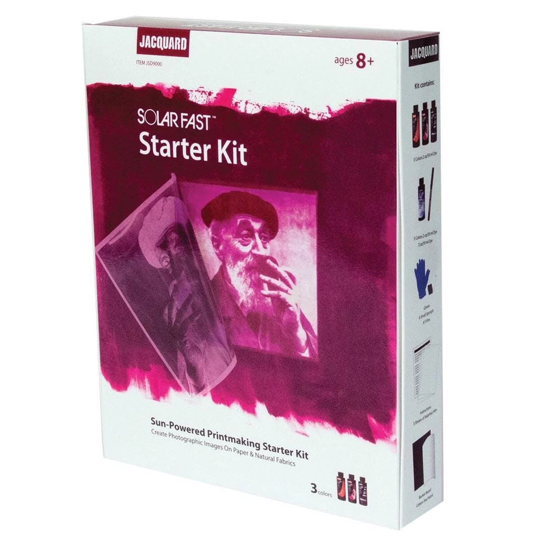 Easily create photographic prints using the sun! Simply apply SolarFast to natural fabric or paper, place items or printed transparency film on top, expose to direct sunlight and watch the color magically appear! Kit includes three 2 oz. bottles of SolarFast, one each of blue, orange and violet, 2 oz. SolarFast wash, six small sponges, eight t-pins, three sheets SolarFast film, film marker, backerboard, cotton test fabric, quick start guide and printed instructions.