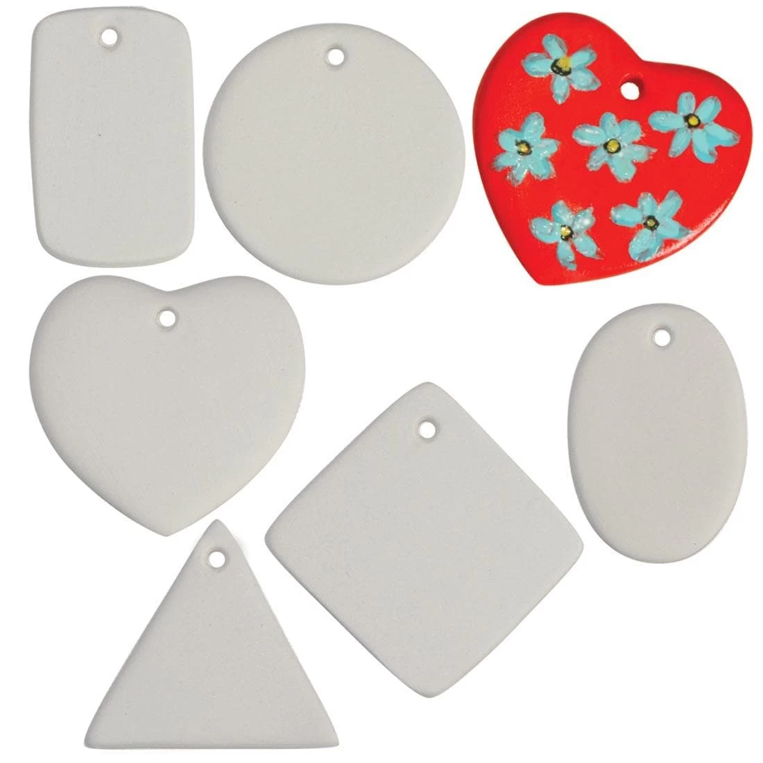 Ceramic bisque medallions are ready to decorate to make colorful ornaments, jewelry pendants, tags and more. Bisque earthenware ornaments have been fired to Cone 04. If decorating with glazes, fire up to Cone 06. Also great for decorating with acrylics. Assortment includes 25 each of rectangle, triangle, heart, circle, oval and square shapes. Each medallion measures approximately 1-1/2″ to 2″ tall and features a pre-drilled hole for easy stringing and hanging.