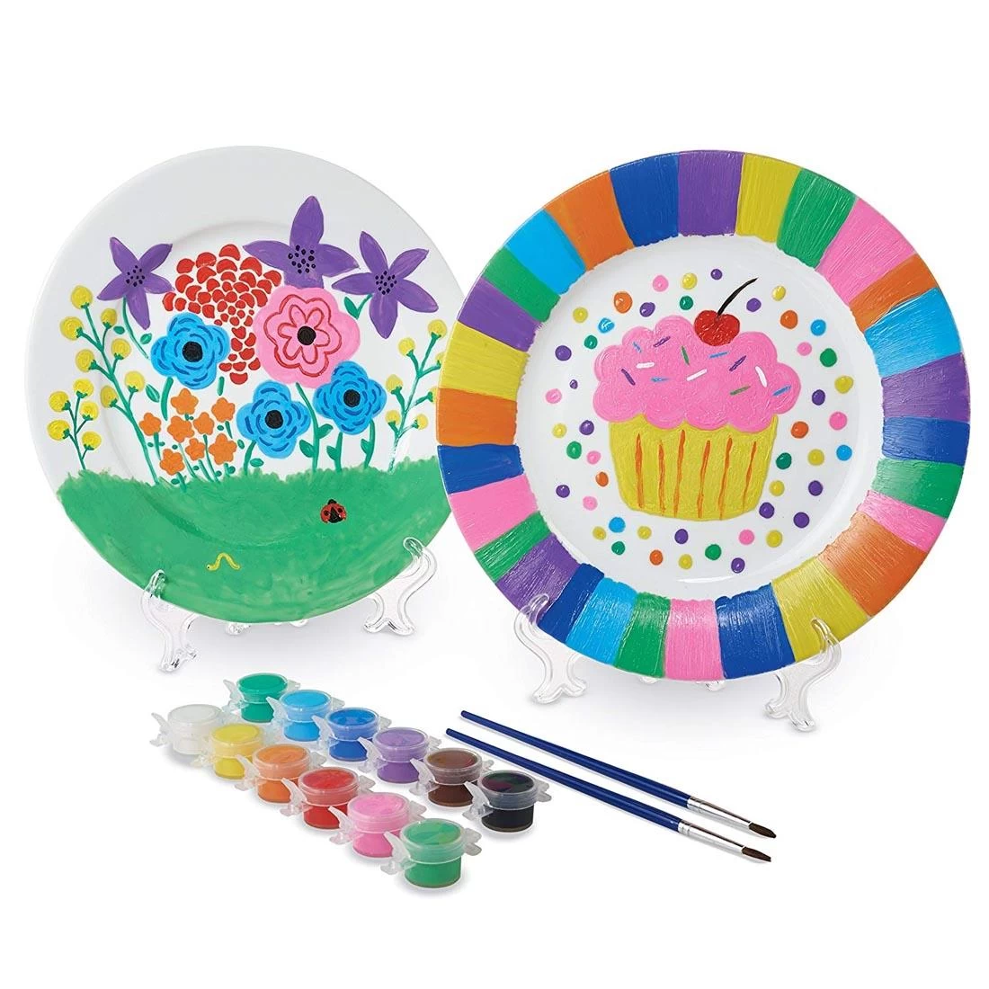 Create fun, festive plates. Simply paint the plates with the included paints and bake in a household oven. Plates are 9 inches in diameter. Includes 2 plates, 12 paints, 2 paint brushes, 2 clear plate stands and complete instructions. Ages 8 and up. Not recommended for food or liquids. Plates are intended to be display pieces only and are not created to withstand washing.