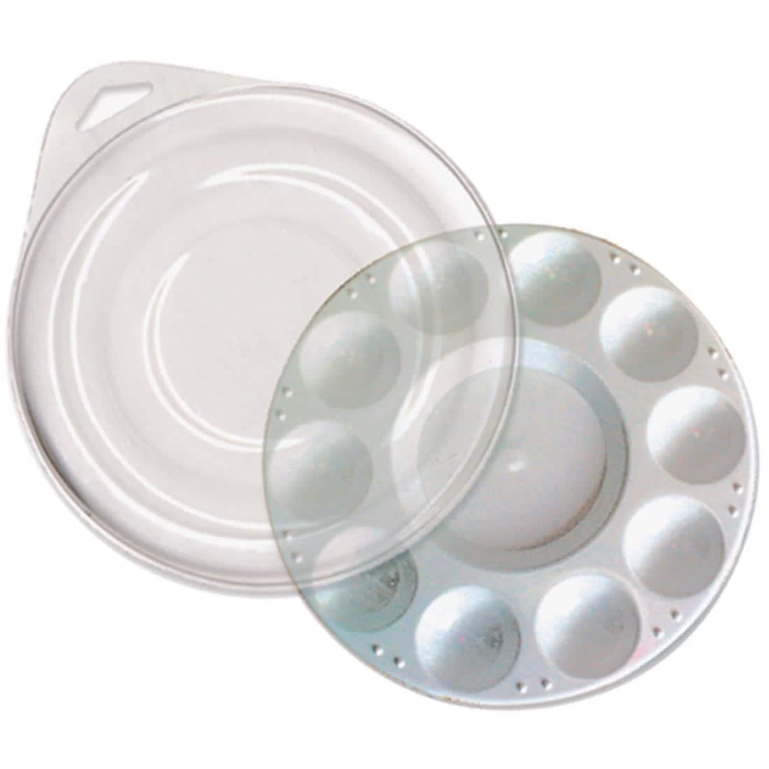 Made of white plastic. 6-2/3″ circle palette with mixing center and 10 small wells. Includes raised brush holders on the rim. Stackable. Comes with a lid.