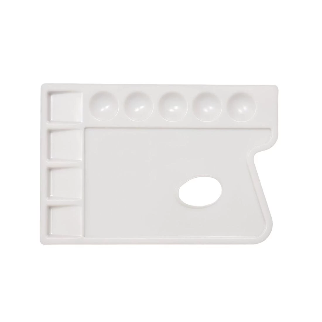 Heavy-duty, white rectangular palette has five round paint wells and four square paint wells. The tray also offers a large area for mixing. Ideal for use with watercolor, acrylic, oil and ink. Measures 6-1/2 x 9-1/2″.