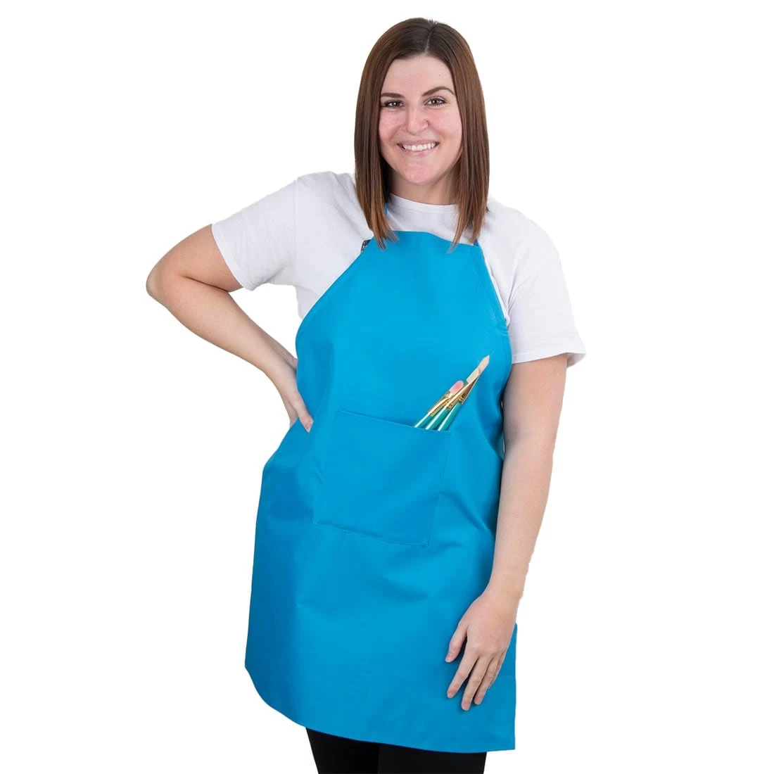 Protect clothing from paint, ink, charcoal and more. Sturdy polyester apron has a front pocket for holding art materials and an adjustable neck strap. Washable. Measures 23-1/2 x 30-3/4″. Color varies.