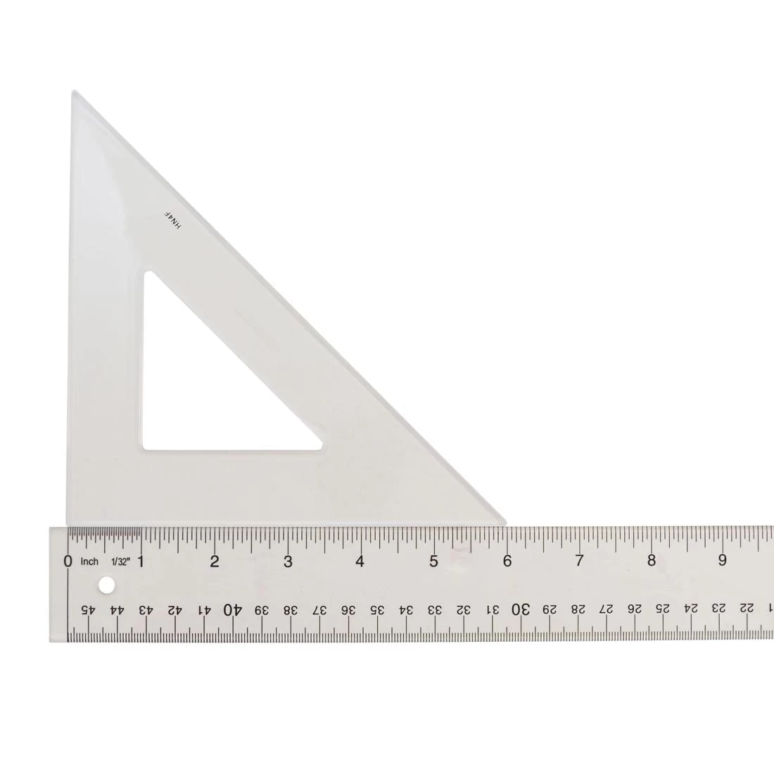 A durable, yet economical, drafting triangle with professional quality features. Double-bevel edges make it easier to lift off the table. Standard, 6″ transparent triangle is made of molded, 0.08″ styrene plastic. 45/90 degrees. (Ruler shown in image not included.)