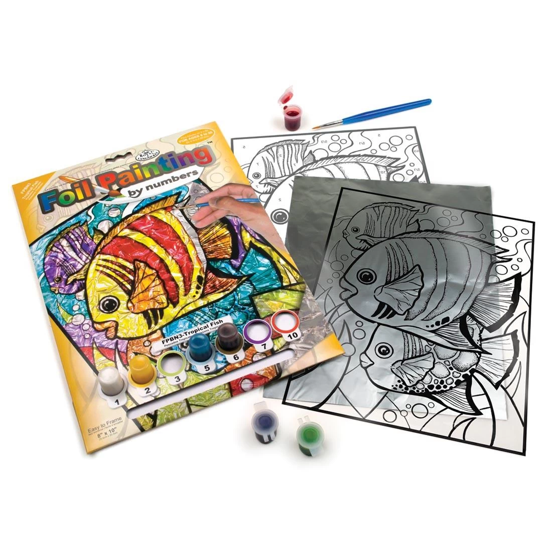 Foil Painting by Numbers is a unique, fun project for all artists, inexperienced or experienced! It is a perfect introduction to glass painting! Because the outline has been pre-printed onto the provided transparency, there’s no need to worry about subject matter or composition! Just read the instructions and painting tips and you can start painting. Upon completion, place the aluminum foil behind your finished painting to accent your display. Includes 6 translucent glass paint pots, 1 paint brush, 1 numbered opaque underlay, 1 white paint pot, 1 transparency, 1 foil underlay and painting instructions. Ages 8 and up.