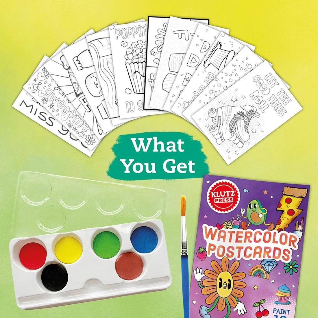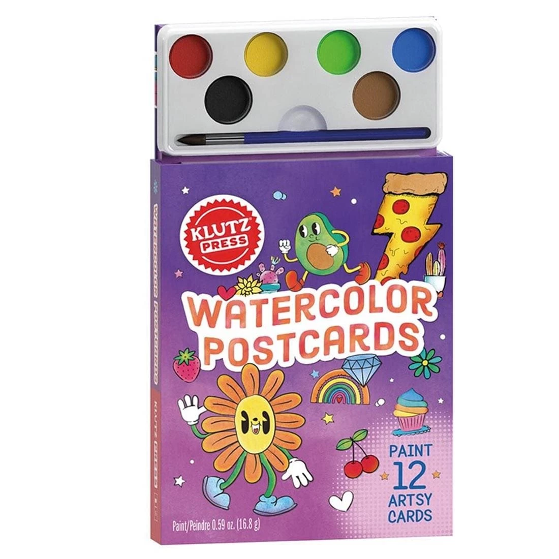 This on-the-go art kit includes everything you need to send custom postcards. Learn the basics of watercolor painting and letter writing, then fill in ready-to-mail postcards with paint. (Simply add a stamp!) A 16-page instruction book gives beginner-friendly painting tips and techniques. Artwork is themed around special occasions, sharing kindness, or just to say hi. Includes 12 watercolor art boards, six watercolor paints in a mixing palette and paintbrush. For ages 6 and up.