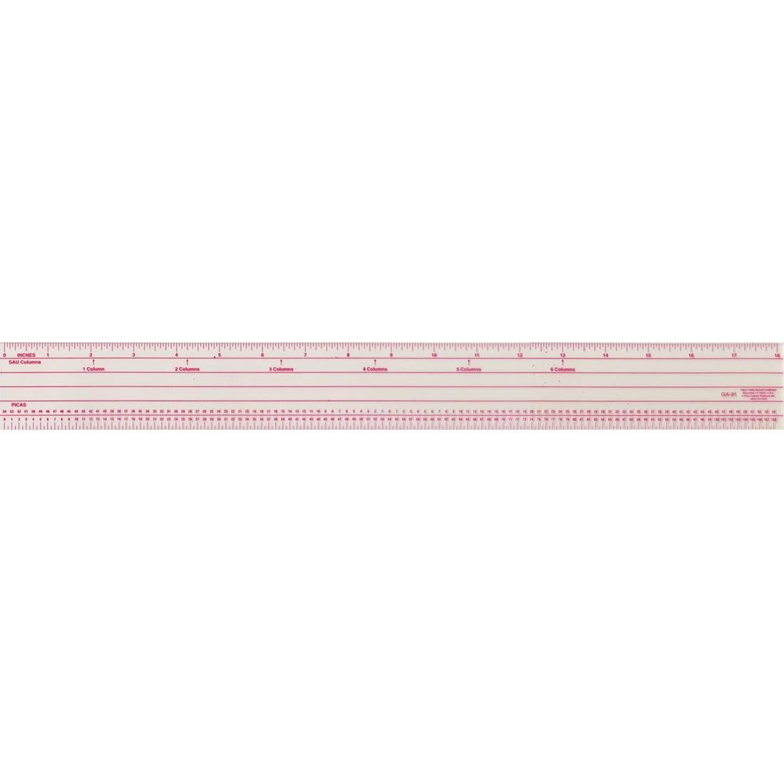 Transparent design for measuring font types. Calibrated in picas with a zero centering pica scale, plus graduations every 1/16″. Features standard column spacing and includes English scale ruler, too. 18×2″ plastic ruler.