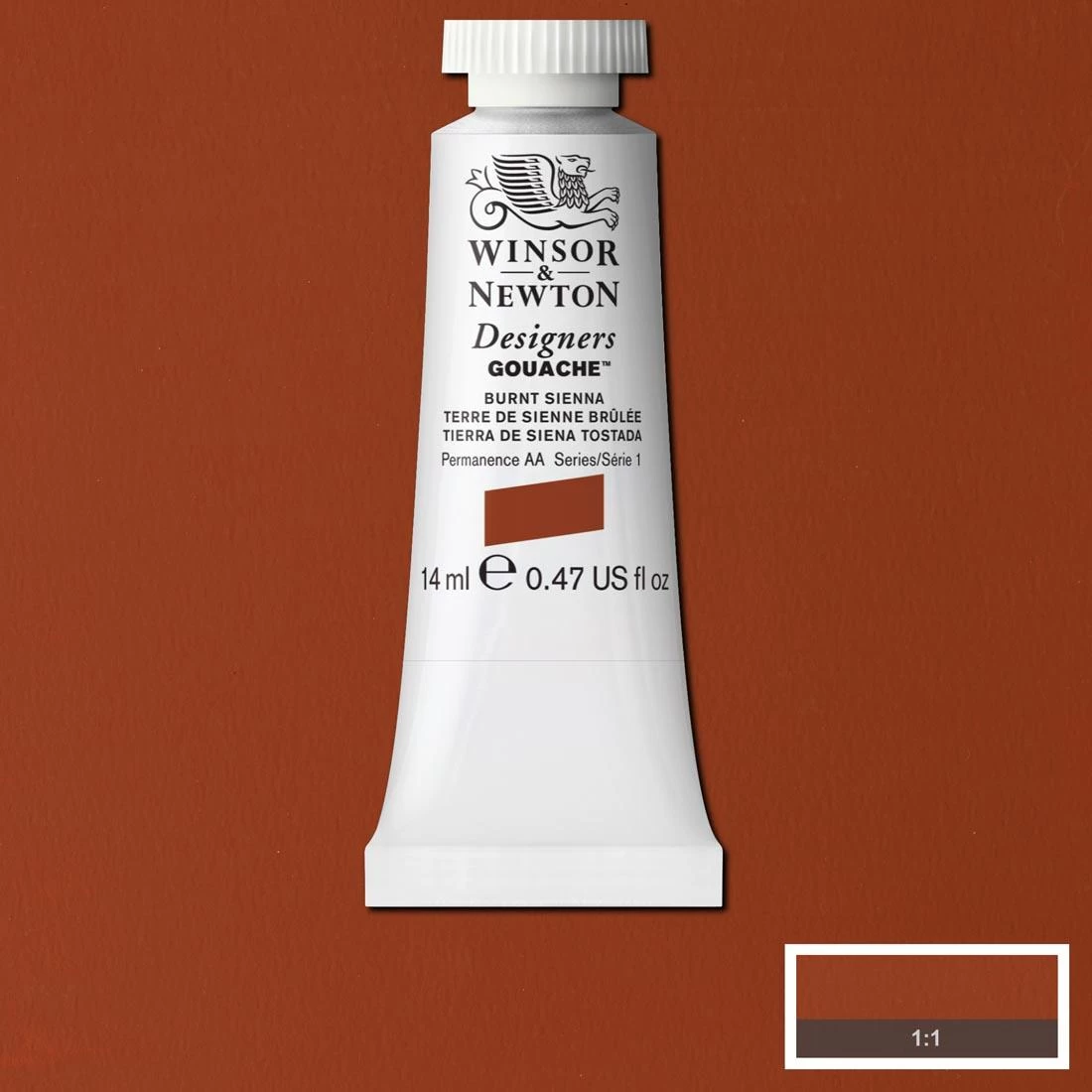 An opaque gouache known for outstanding brilliance. Winsor and Newton Designers Gouache is accepted as the finest quality range available, with a wide color spectrum catering for both designers and fine artists. Enjoy the exceptionally smooth flow and fine detail capabilities. Light colors easily cover dark colors allowing dark to light shading. Thinned with water, these finely ground colors can be used with an airbrush or pen. In addition, unsurpassed covering power is achieved by the high level of pure pigments. In use, the colors’ even flow produces flat washes without streaking. Colors can be safely intermixed. Fully compatible with Winsor and Newton watercolor products. For fine art painting, watercolor paper is recommended to exploit the widest variety of techniques and ensure long term stability. 14ml. Burnt sienna. AP Seal, non-toxic.