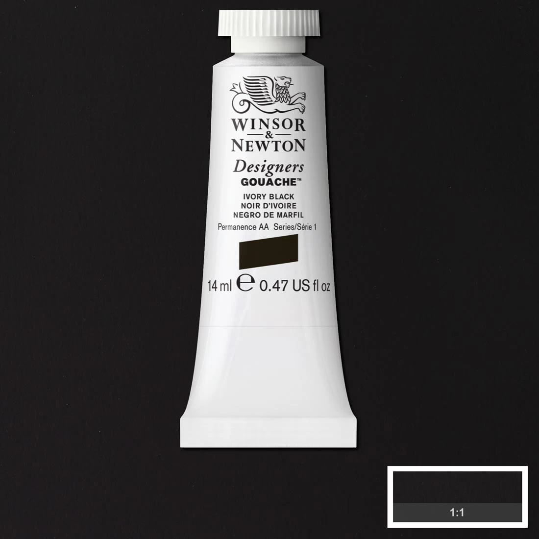 An opaque gouache known for outstanding brilliance. Winsor and Newton Designers Gouache is accepted as the finest quality range available, with a wide color spectrum catering for both designers and fine artists. Enjoy the exceptionally smooth flow and fine detail capabilities. Light colors easily cover dark colors allowing dark to light shading. Thinned with water, these finely ground colors can be used with an airbrush or pen. In addition, unsurpassed covering power is achieved by the high level of pure pigments. In use, the colors’ even flow produces flat washes without streaking. Colors can be safely intermixed. Fully compatible with Winsor and Newton watercolor products. For fine art painting, watercolor paper is recommended to exploit the widest variety of techniques and ensure long term stability. 14ml. Ivory black. AP Seal, non-toxic.