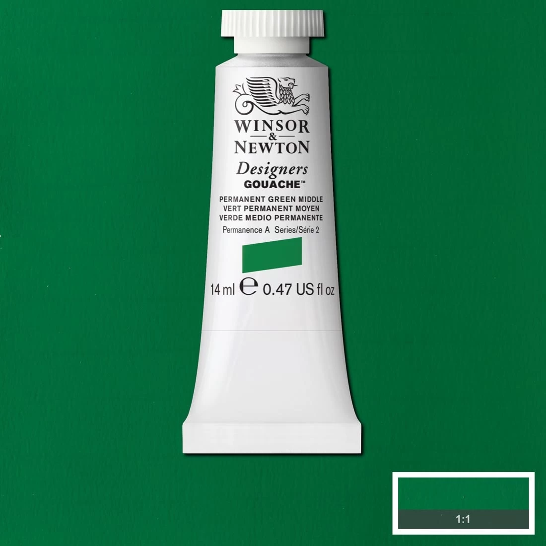 An opaque gouache known for outstanding brilliance. Winsor and Newton Designers Gouache is accepted as the finest quality range available, with a wide color spectrum catering for both designers and fine artists. Enjoy the exceptionally smooth flow and fine detail capabilities. Light colors easily cover dark colors allowing dark to light shading. Thinned with water, these finely ground colors can be used with an airbrush or pen. In addition, unsurpassed covering power is achieved by the high level of pure pigments. In use, the colors’ even flow produces flat washes without streaking. Colors can be safely intermixed. Fully compatible with Winsor and Newton watercolor products. For fine art painting, watercolor paper is recommended to exploit the widest variety of techniques and ensure long term stability. 14ml. Permanent green middle. AP Seal, non-toxic.