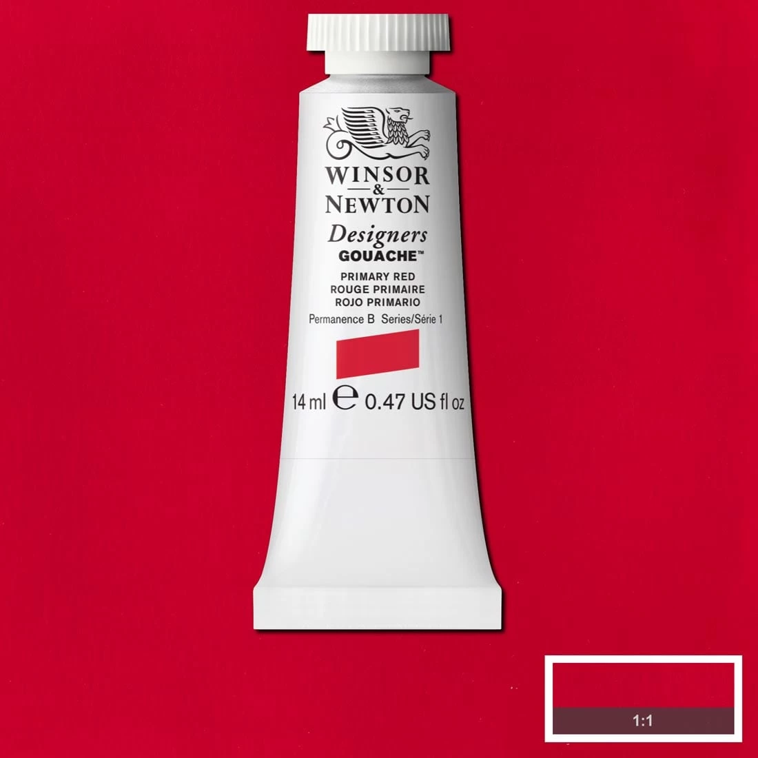 An opaque gouache known for outstanding brilliance. Winsor and Newton Designers Gouache is accepted as the finest quality range available, with a wide color spectrum catering for both designers and fine artists. Enjoy the exceptionally smooth flow and fine detail capabilities. Light colors easily cover dark colors allowing dark to light shading. Thinned with water, these finely ground colors can be used with an airbrush or pen. In addition, unsurpassed covering power is achieved by the high level of pure pigments. In use, the colors’ even flow produces flat washes without streaking. Colors can be safely intermixed. Fully compatible with Winsor and Newton watercolor products. For fine art painting, watercolor paper is recommended to exploit the widest variety of techniques and ensure long term stability. 14ml. Primary red. AP Seal, non-toxic.